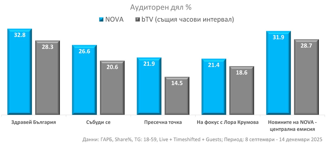 Освен с развлекателна програма, през есенния сезон NOVA затвърди категоричното си лидерство и с отличните резултати на новините и публицистични предавания.