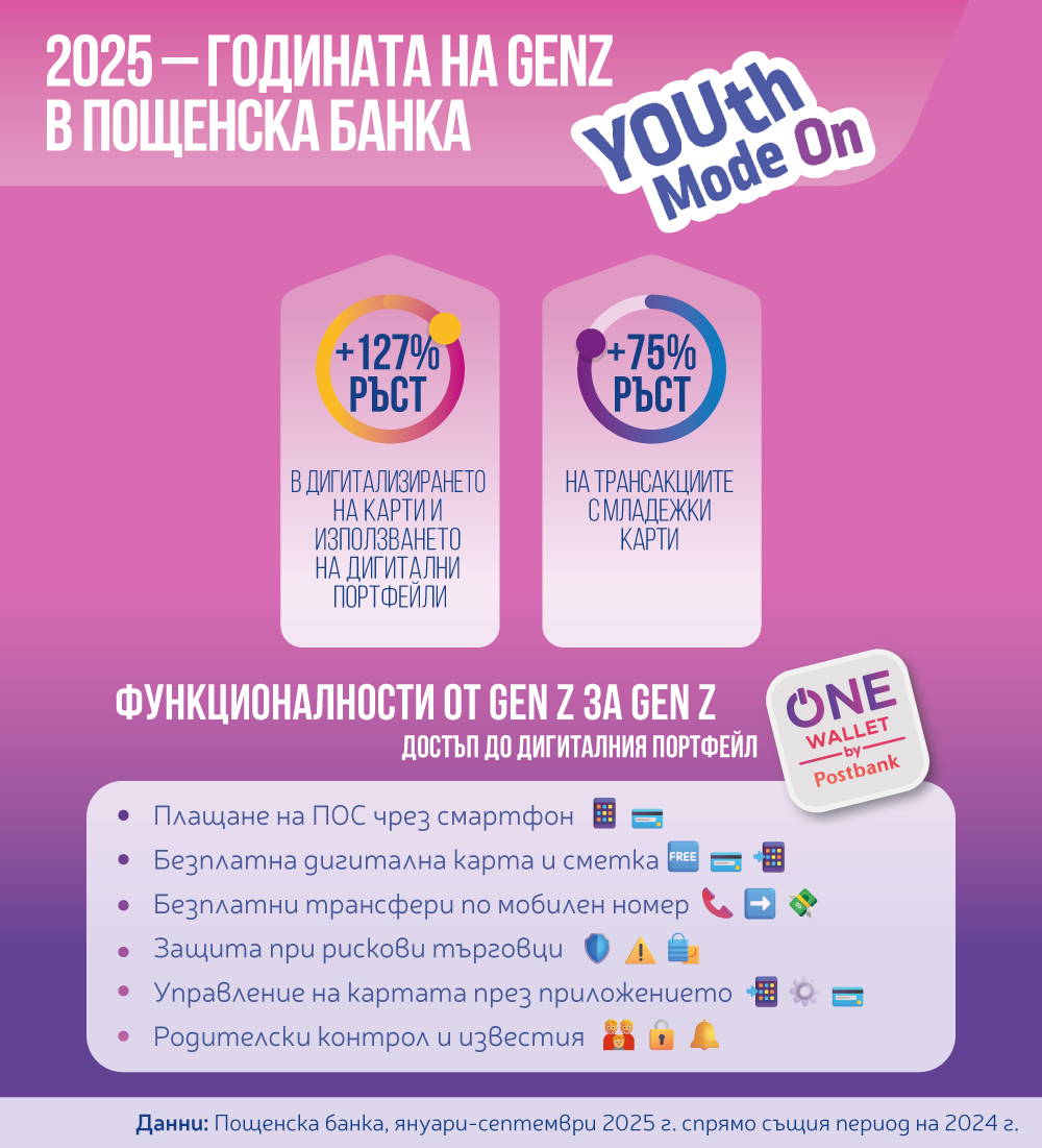С младежката програма „Project YOUth“, разделена в три възрастови групи – от 7 до 14 години, от 14 до 18 години и от 18 до 26 години, Пощенска банка се фокусира и в изграждането на стабилна връзка с най-младите потребители на нейните продукти и услуги. За периода януари-септември 2025 г. спрямо същия период на 2024 г. данните на банката демонстрират впечатляващ ръст от 127% в дигитализирането на карти и използването на дигитални портфейли сред младото поколение. За същия период банката регистрира увеличение с 23% на активното младежко портфолио и ръст от 75% на всички трансакции с младежки карти.