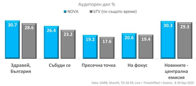 NOVA отчете значителна преднина за първия месец от есенния телевизионен сезон пред втората телевизия в класацията. След като стартира всички праймтайм формати, медията продължава да привлича вниманието на зрителите в активна възраст (18-59 г.) и да доминира безапелационно сред всички телевизии в България. Според официалните пийпълметрични данни, и трите развлекателни предавания от есенната програмна схема са привлекли най-висок среден аудиторен дял сред телевизионните зрители на възраст 18-59 години. Втората телевизия в класацията остава далеч назад по същото време.