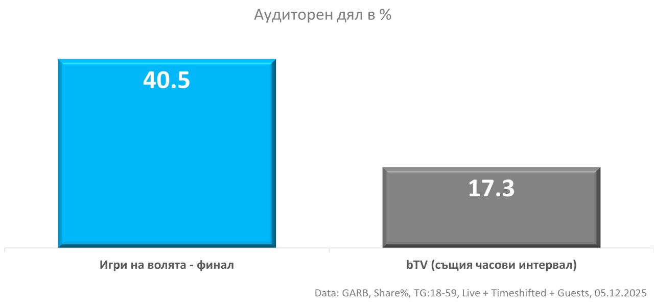 Ф иналът на екстремния риалити формат „Игри на волята“ бе безапелационен лидер в телевизионния ефир в петък вечер. Битката за голямата победа и наградата от 100 000 лв. на Арената в Дивия север привлече над 40% от всички зрители в активна възраст (18-59 г.). Втората телевизия по това време е с над 2 пъти по-нисък резултат, с отчетен 17.3% аудиторен дял по същото време.