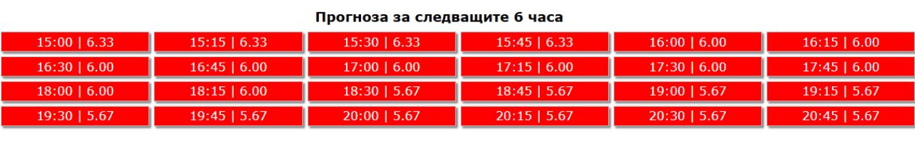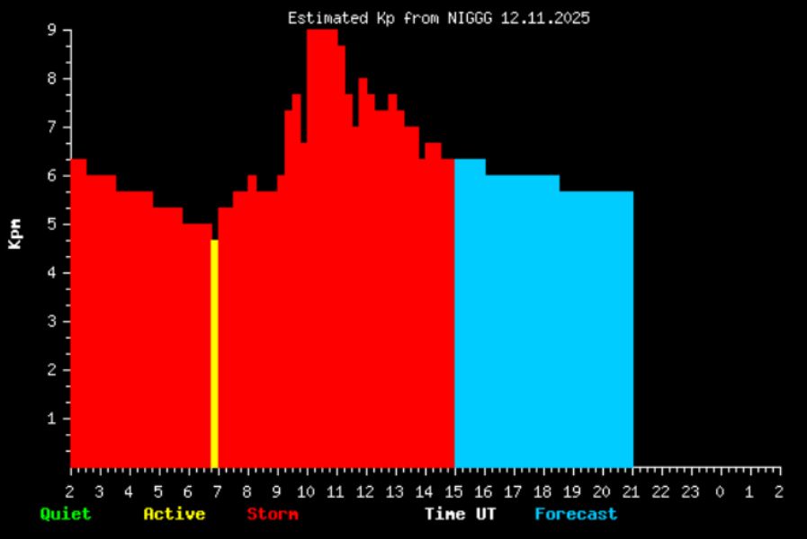 Националният институт по геофизика, геодезия и география (НИГГГ) публикува данни за Kp1 индекса, измерващ смутеността на земното магнитно поле. Последните 12 часа показват Kp между 4.67 и 9.00, като по-голямата част от часовите интервали са в категория „буря“. Прогнозата за следващите 6 часа остава висока - Kp 6.00 - 7.00.