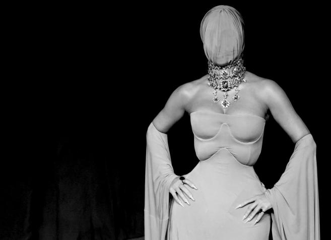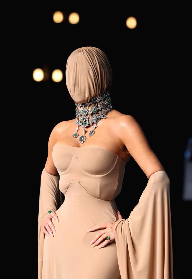 Тя съчета маската с корсетна рокля без презрамки с падащи ръкави в същия телесен цвят, част от колекцията Maison Margiela Fall 2025 Couture, и дълги телесни нокти в тон с облеклото.