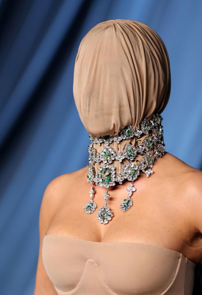 Маската на Кардашиян бе допълнена с многослоен чокър, украсен с кристали, зелени скъпоценни камъни и висулки във формата на кръстове — също част от визията на Maison Margiela.