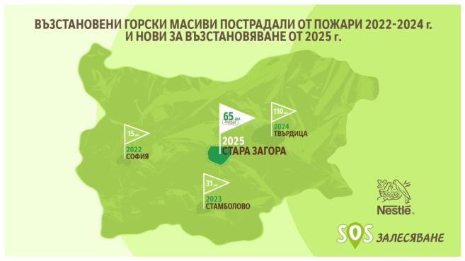 С тара Загора прие символа на инициативата на Нестле България - „Залесяваме активно“ – златната лопата, която пристигна директно от София, за да даде старт на новото издание на националния конкурс за възстановяване на опожарени горски територии. С реализацията на проекта ще бъдат възстановени 65 декара опожарена гора в местността „Седми километър“ – едно от най-засегнатите места по време на мащабните пожари през лятото на 2024 г.