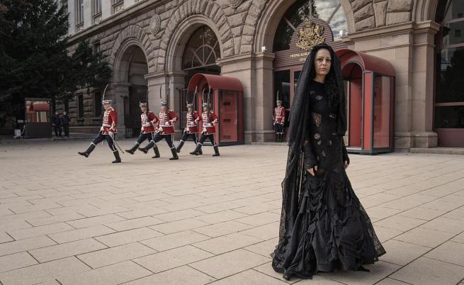 Н а 3 ноември минувачи в центъра на столицата забелязаха момиче, облечено в елегантна черна сватбена рокля и с воал, пред сградите на Народното събрание и Президентството на Република България. Появата ѝ привлече внимание не само заради необичайния цвят на роклята, но и заради кинематографичната атмосфера, която създава.
