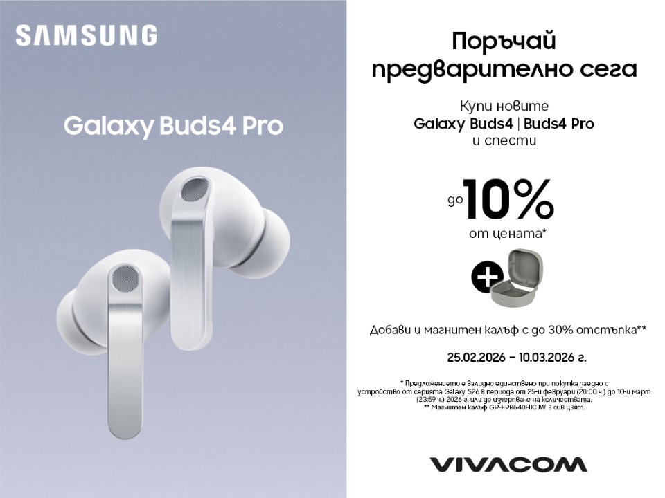 Vivacom приема предварителни поръчки за хитовата серия на Samsung Galaxy S26, още в деня на световната премиера. Предварителните заявки за устройствата стартират на 25 февруари 2026 г. от 20:00 ч. и продължават до 23:59 ч. на 10 март 2026 г., като потребителите могат да спестят до 200 € | 391.17 лв. и да получат два пъти повече памет за съхранение. В същия период Vivacom стартира продажбата и на новите безжични слушалки Galaxy Buds4 и Buds4 Pro с до 10% отстъпка от цената и до 30% отстъпка за магнитен калъф, закупени в комплект със Samsung Galaxy S26.