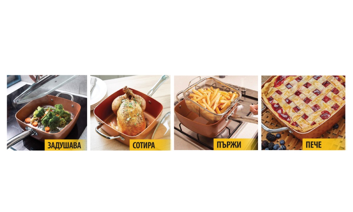 Copper Chef Pan е универсален тиган 6 в 1, който може да замени повечето съдове в кухнята: пържене, печене, варене, задушаване,