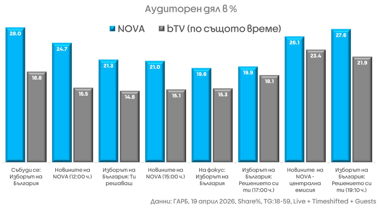 Н а 19 април в България се проведоха извънредни парламентарни избори. В деня на вота NOVA предложи специална програма с над 17 часа телевизионно съдържание, което започна преди 7 часа сутринта и приключи късно след полунощ. Според официалните пийпълметрични данни аудиторният дял на NOVA сред населението в активна възраст (18-59 г.) средно за целия часови интервал е над 25%, което е с 30% повече от резултата на втората телевизия в класацията. NOVA води убедително във всички програмни сегменти, посветени на изборите за 52-ото Народно събрание.