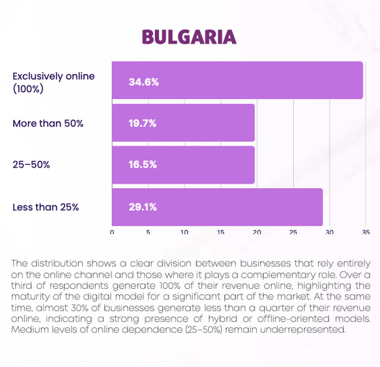 - 34,6% са чисто онлайн бизнеси (100% приходи от е-търговия).