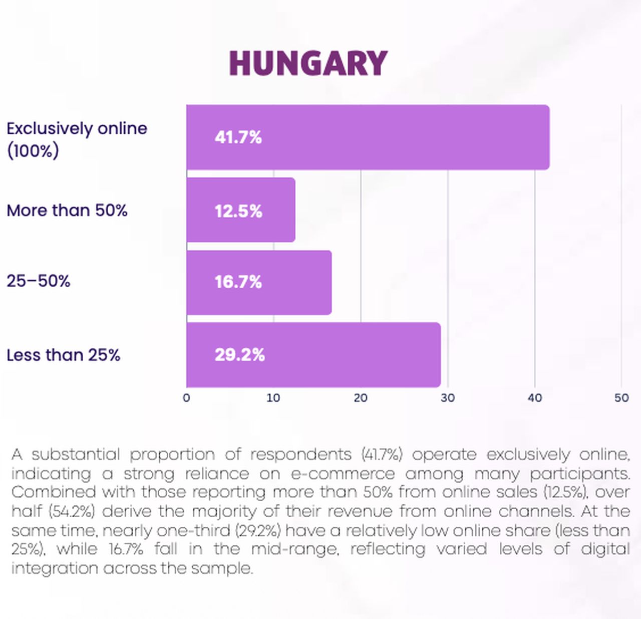 - 41,7% продават изцяло онлайн, а други 12,5% споделят, че повече от половината им приходи идват от интернет.