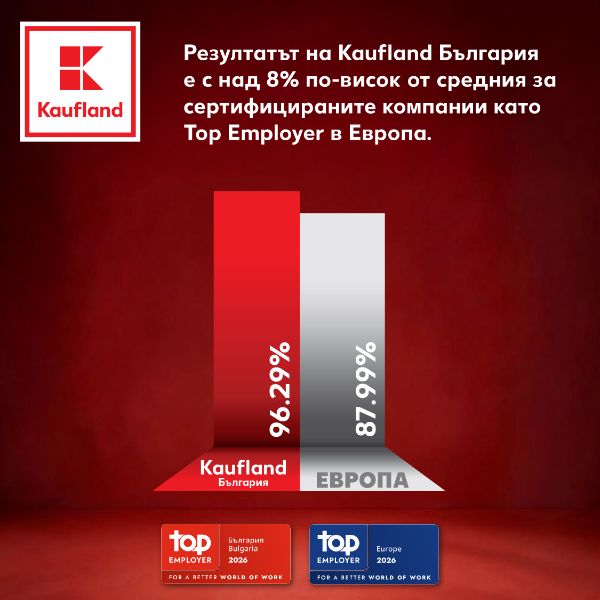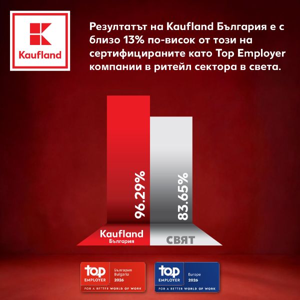 Kaufland България затвърди лидерската си позиция като работодател №1 в ритейл сектора у нас. Компанията заслужи за осма поредна година престижния сертификат Top Employer от независимия Top Employers Institute, като през 2026 г. постигна своя най-висок до момента общ резултат от 96,29%. Признанието идва след задълбочен международен одит и поставя Kaufland сред ограничен кръг компании в Европа, които последователно надминават глобалните стандарти в управлението на хора.
