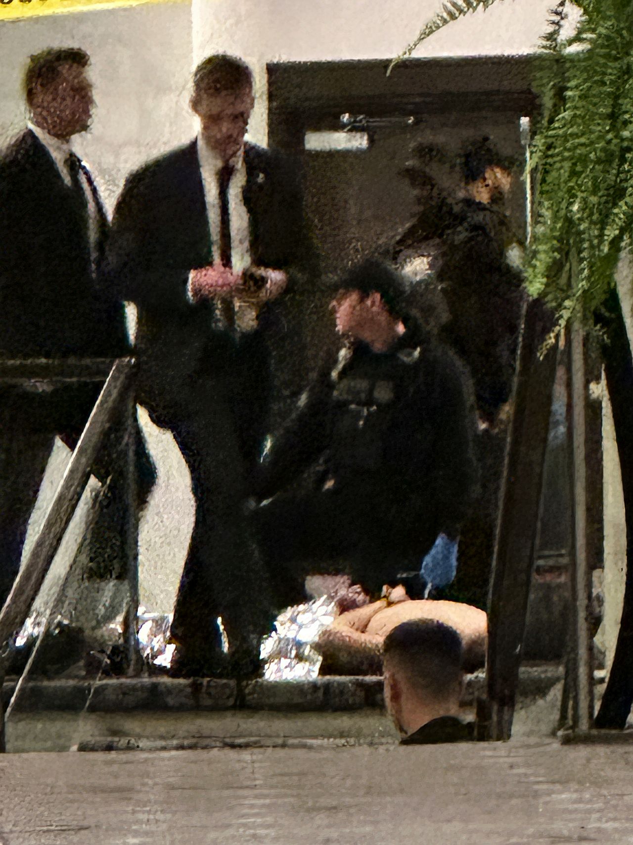 Преди да стигне до пункта, той сваля дългото си черно палто и разкрива помпената пушка, която носи. След това пробягва през охранителния контрол към залата, сцена, заснета на видео, публикувано от Тръмп същата вечер.