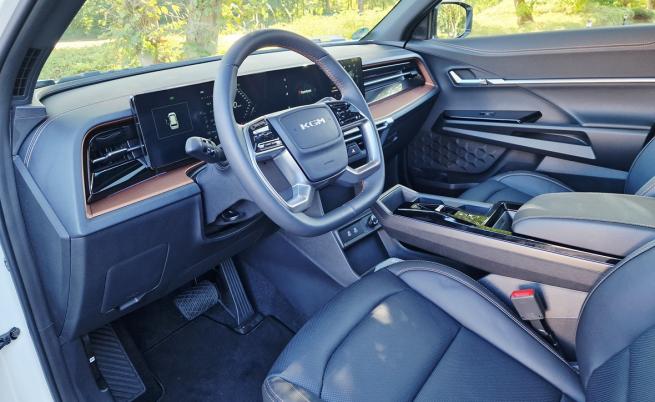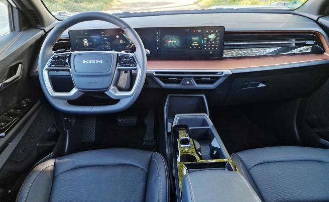 Разположението на двата 12,3-инчови екрана (в един блок), както и изборът на физически бутони на волана, дават ясна представа за страната на произход на Torres. Със сигурност има повече от бегла прилика с философията на дизайна на Hyundai/Kia, ако не и същото тактилно качество. В пълен контраст е изгледът на приборното табло, който е почти идентичен с този на BMW.