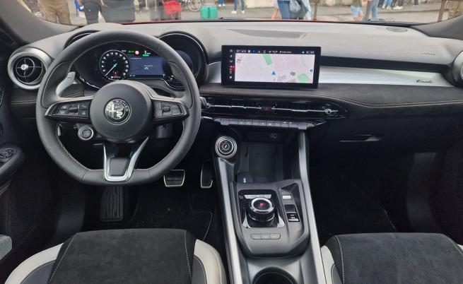 За това допринасят няколко неща в интериора. На първо място стои философията на Alfa Romeo, която Жан-Филип Импарато определи много ясно и разбираемо: „Ние компютри на колела няма да правим“. За нас важен е водачът и всички усещания, които едно шофиране трябва да дава. Да, имаме телескопичното (дигитално с диаметър 12,3 инча) приборно табло, имаме и 10,25-инчов централен дисплей, но с това се изчерпва дигитализацията. Екранът е завъртян към водача, самият той седи в страхотни (все пак карам специалната серия Sport Speciale) като опора и естетика седалки, тапицирани в Alcantara. Със същия материал е облицовано арматурното табло, контрастните шевове са навсякъде в интериора. Проблемът са по-твърдите и груби пластмаси на места в купето.