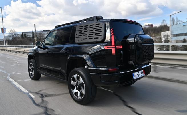 Разбира се, подобно на другите китайски модели, на таблото имаме голям 15,6-инчов дисплей, от който се управляват многото функции в този автомобил. Разликата е, че под него има поле с много атрактивно оформени метални бутони за едни от най-често използваните функции в автомобила. Под тях пък идва сензорният циферблат на часовника с няколко различни изгледа, от който се активира някой от деветте режима за задвижване. Под него има още три бутона, както и традиционните за подобен офроудър дръжки. Не мога да пропусна и перчатките на командното табло на тавана, с част от които се контролират някои от 13-те електрически изхода (включително 6kW функция V2L).