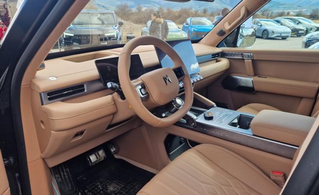 Не възнамерявам да обръщам повече внимание на външния облик, защото за мен интериорът е много по-впечатляващ. Това ми впечатление идва от материалите. Толкова кожа и велур отдавна не съм виждал, а китайците остават последния бастион на естествената кожа. Това се комбинира много умело с метални повърхности, особено на фино фрезованите метални високоговорители на аудио системата Dynaudio с 18 високоговорителя. Седалките са с масаж, подгрев и вентилация, панорамата е отваряема, има и задължителна щора. Метална е и имитацията на пистолетен затвор, който, заедно с дръжката на вратата наподобява много Desert Eagle. Намирам го за проява на лош вкус, но пък това е детайл, който откроява модела в социалните мрежи.