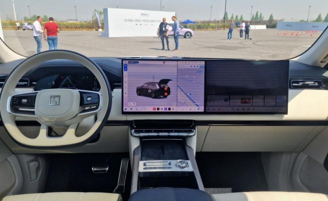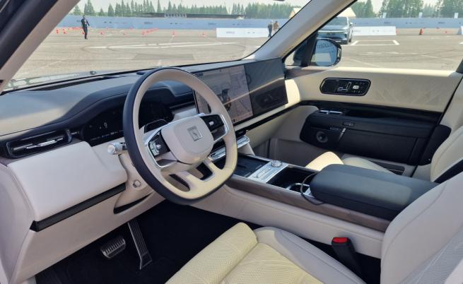 Отпред доминиращи са екраните, естествено, с два съединени „телевизора“ в средата е пред предния пътник. Кристалният въртящ се регулатор е визуален акцент, който безпогрешно поставя ударение върху луксозния характер на машината, чийто волан с плоско дъно предполага нещо повече от спокойна возия по дългите и широки китайски пътища.