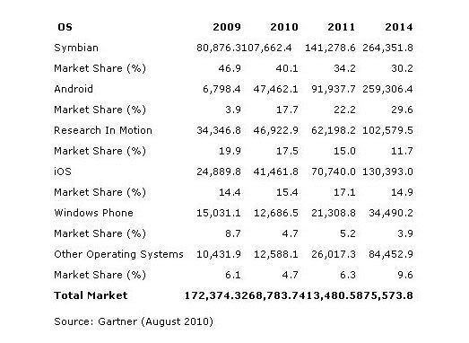 Според проучването Symbian ще остане на първо място още четири години, което ще се дължи най-вече на достъпните смартфони с марката Nokia, но през 2014 Android ще има реални шансове да оглави класацията.